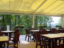 Eine große Terrasse ermöglicht es die angebotenen Speisen im Freien zu sich zu nehmen in einem wunderbaren grünen Rahmen mit einer einzigartigen Aussicht auf das Tal und die Berge, die es umgeben.